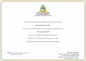 Está circulando o convite da Assembleia Legislativa do Maranhão para a solenidade de comemoração dos 104 anos do PCdoB. A cerimônia será realizada na ALEMA no próximo dia 27, às 16h, e foi solicitada por indicação do deputado estadual Rodrigo Lago, filiado ao partido.