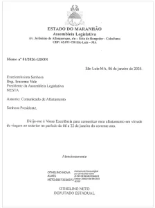 Apesar da discrição nas redes, a viagem foi comunicada oficialmente à Assembleia Legislativa do Maranhão. De acordo com publicação no Diário Oficial da Alema, Othelino Neto informou à presidente da Casa, deputada Iracema Vale, que se ausentaria do país entre os dias 6 e 22 de janeiro de 2026, em conformidade com o regimento interno.