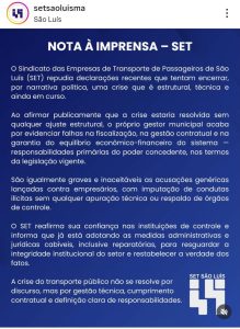O Sindicato das Empresas de Transporte de Passageiros de São Luís (SET) divulgou nota pública rebatendo declarações recentes sobre a crise do transporte coletivo na capital maranhense. Segundo a entidade, a situação não pode ser tratada como resolvida por meio de discursos políticos, pois envolve problemas estruturais e técnicos que ainda persistem no sistema.